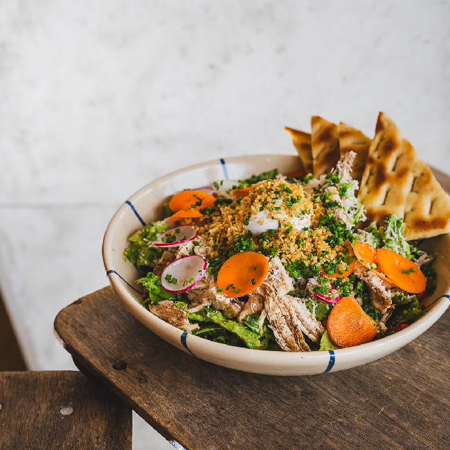 Roasted farm chicken, poached egg, romain lettuce, crunchy crumbs, ceasar dressing, parmesan.