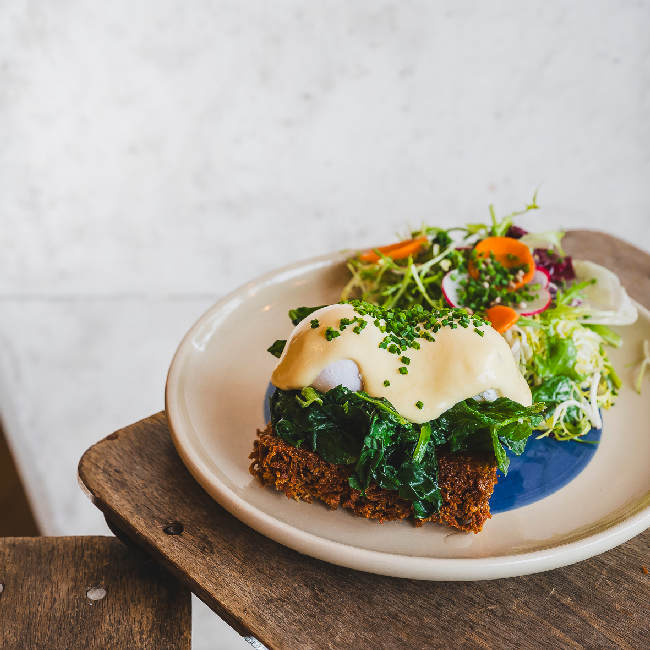 Poached eggs, rosti, light hollandaise, spinach, chives, side salad, dressing.