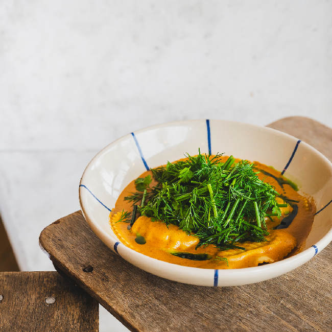 Signature crab ravioli, langoustine creamy bisque, fresh herbs, basil oil.