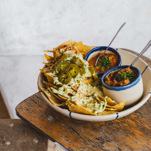 Corn tortilla chips, chilli con carne, aguacate salsa, melted cheddar sauce, pico de gallo salsa and jalepanos.
