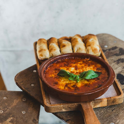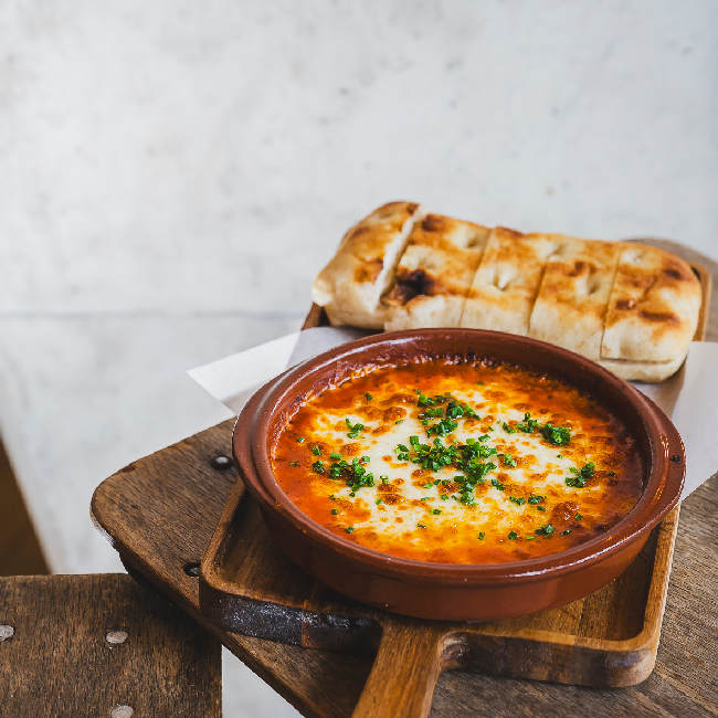 Oven roasted smoked mozzarella, pomodoro, bread.