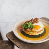 Poached eggs, rosti, light hollandaise, spinach, chives, side salad, dressing.