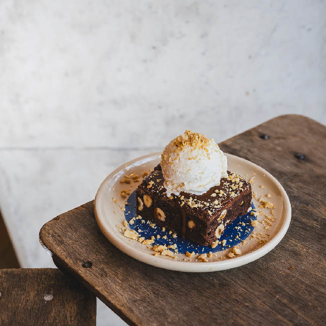 Double chocolate and nuts brownies, fudge, peanuts, vanilla ice cream.