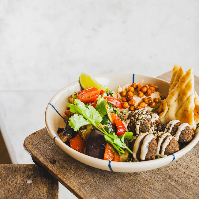 Herbs fallafel, tahina, confit mediteranean veggies, tabouleh, houmous, flat bread.