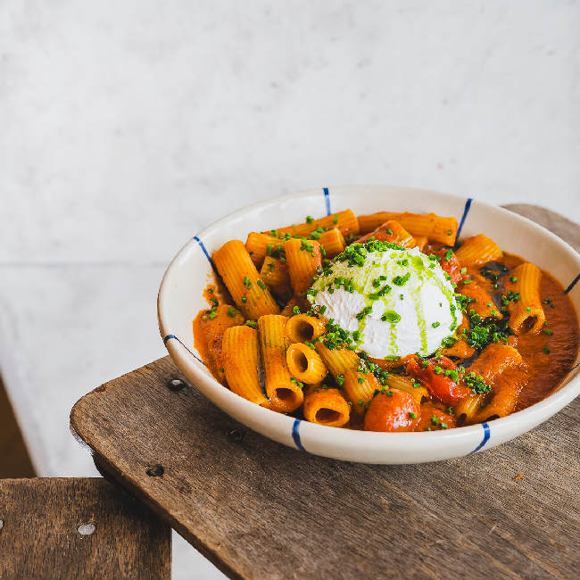 Tomato sauce, rigatoni, ricotta, lemon zest, basil oil.